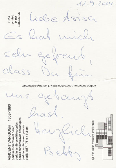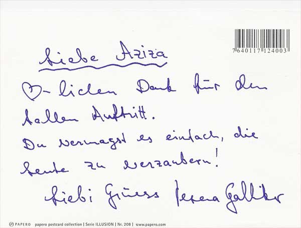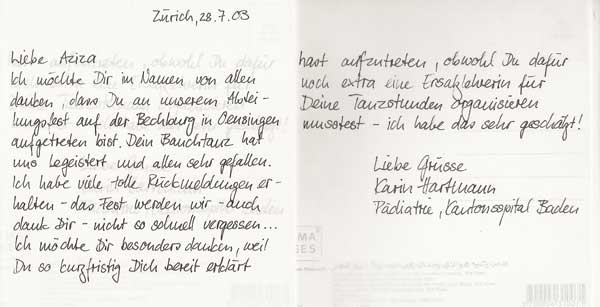 2003: Weitergeleitetes E-mail an die Agentur, welche die Bauchtänzerin Princess AZIZA für einen Auftritt an einer Hochzeit im "Giardino Verde", Uitikon (www.giardinoverde.ch) vermittelt hatte: